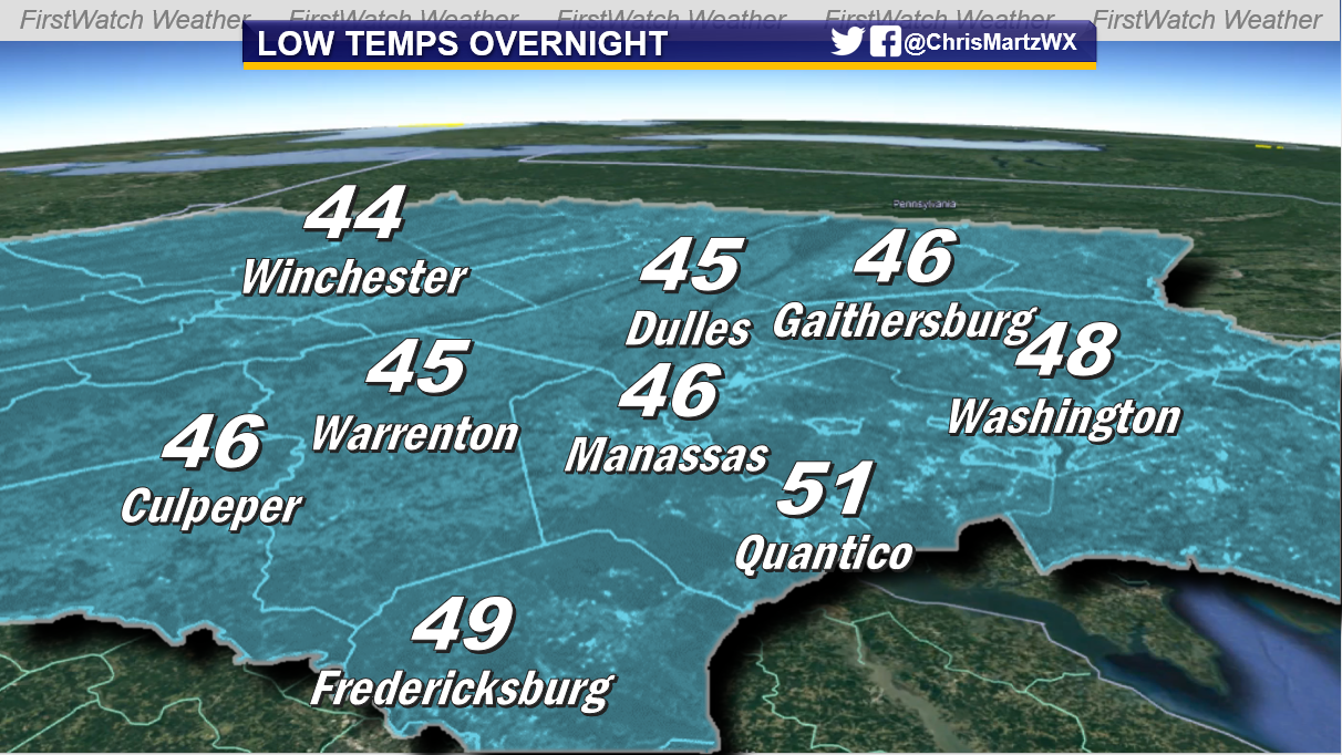 As cloud cover moves in tonight, lows will hang in the 40s.