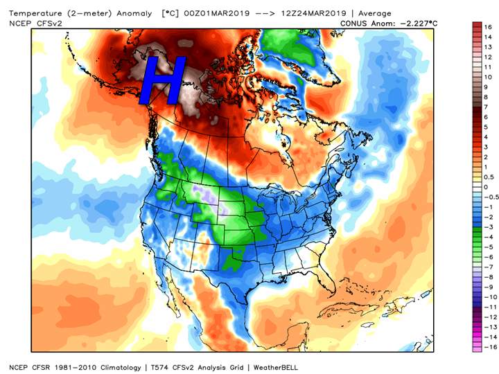 First, let’s take a look at what’s been happening this month. Over the past 24 days, it has been pretty chilly relative to average across the Lower 48, especially across the west. This is because there is a nice high pressure block over Alaska and the Arctic forcing the cold air south. This is basic laws of physics; for every action, there is an equal and opposite reaction – although some loonies out there would like to think this is an apocalypse of climate – therefore for every trough, there is a ridge.