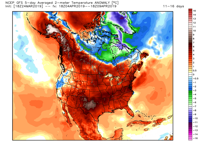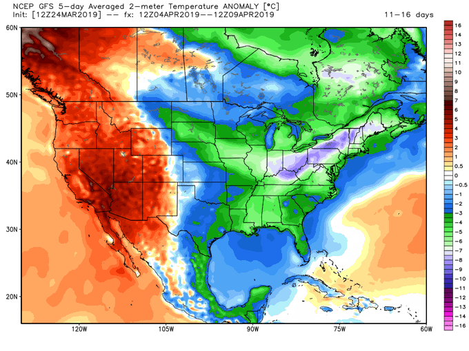 Looking forward, there is a bit of model confusion. The 12Z CFS run from earlier today is predicting an eastern pool of colder than average temperatures with some ridging in the west for April 4th through the 9th. This makes a lot of sense based on the laws of physics – if you have a trough in the east, then you must have ridging in the west.