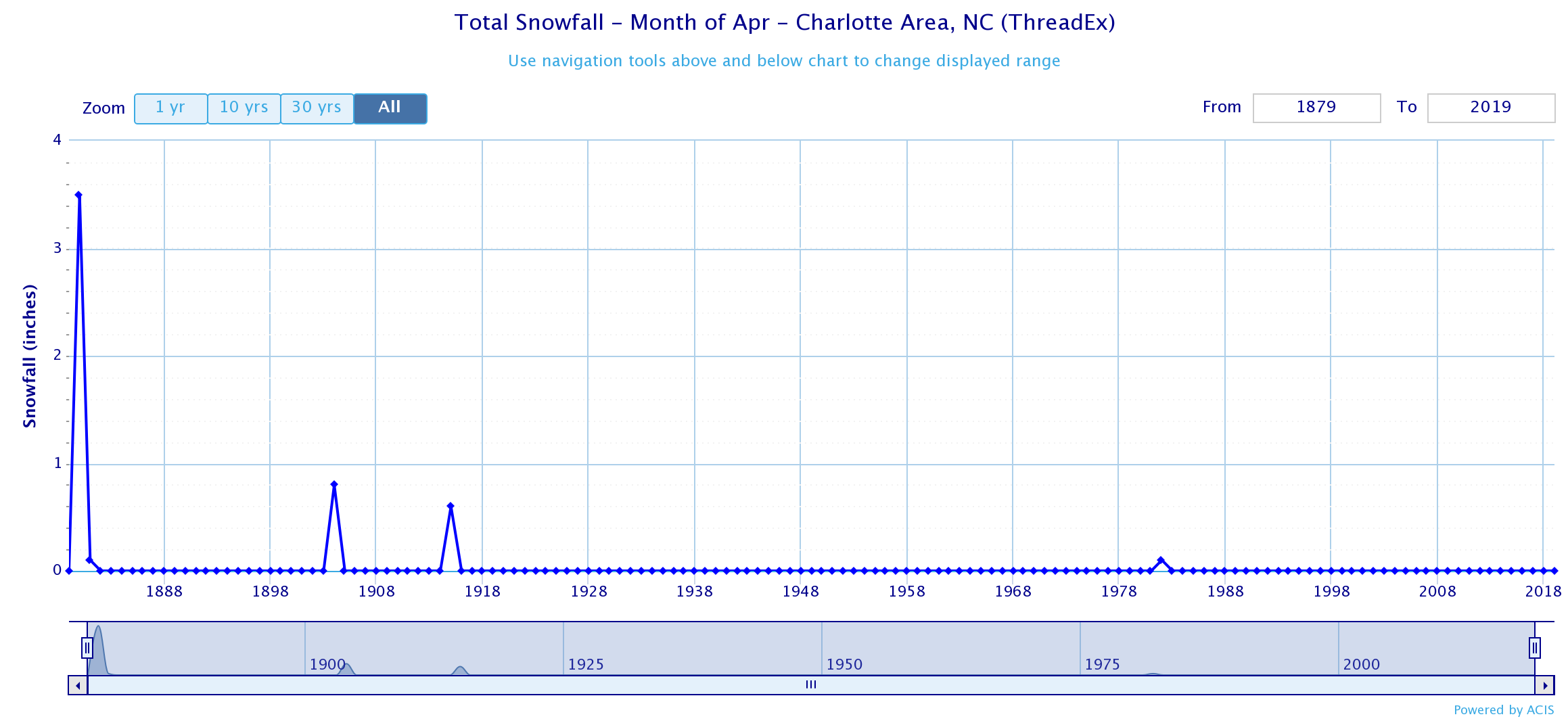 There have been a handful of April snowfalls, but most of them occurred prior to 1920; 3.5 inches in 1880, 0.1 inch in 1881, 0.8 inch in 1904, and 0.6 inch in 1915 (Figure 1).