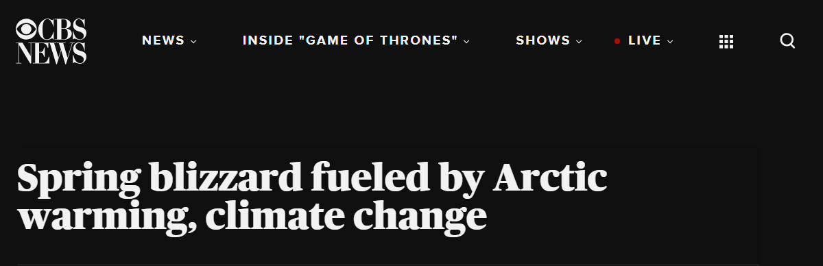 Jeff Berardelli, Spring blizzard fueled by Arctic warming, climate change (CBS News, 12 Apr. 2019).