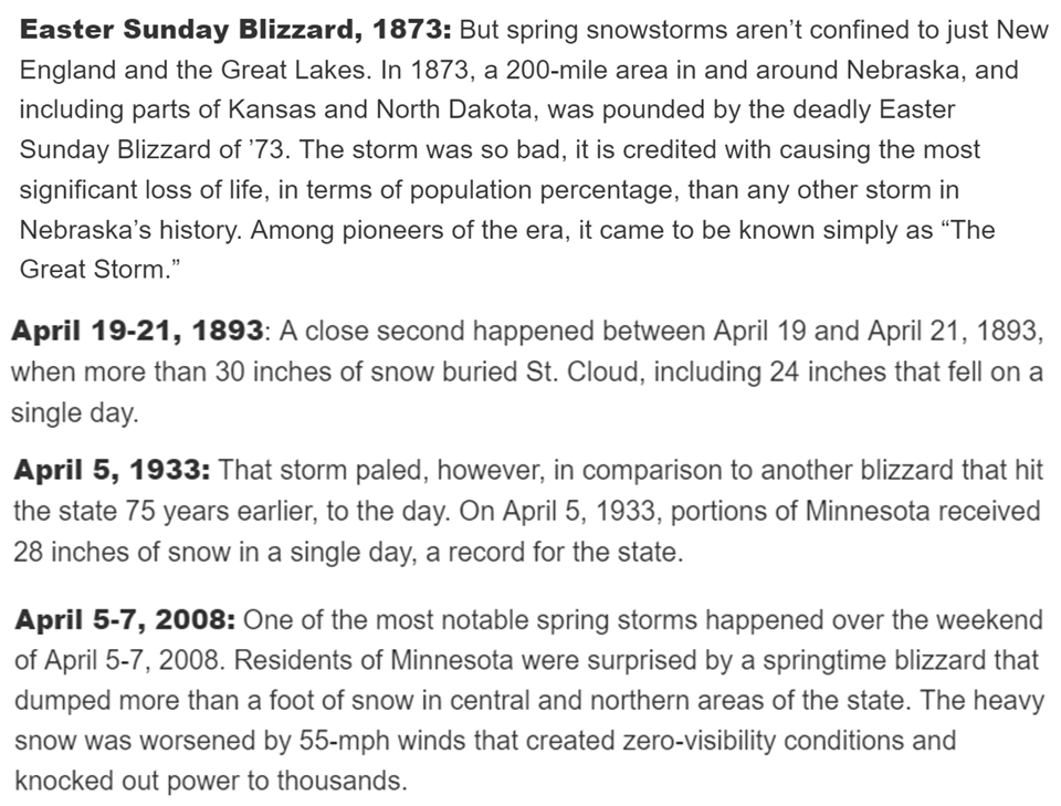 [9] McLeod, Jamie, Snow Kidding! Historic Spring Snowstorms (Farmer’s Almanac) https://www.farmersalmanac.com/think-snow-is-only-for-winter-think-again-3150 Retrieved 14 April 2019.