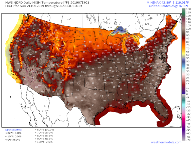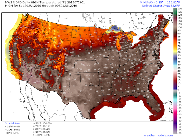While the heat wave will get progressively worse throughout the course of the week as the ridge strengthens its grip, the weekend looks to be a “bake fest” (Figures 2 and 3). Highs across the lower Plains and up and down the eastern seaboard will be closing in on the 100° mark Friday, Saturday, and Sunday.