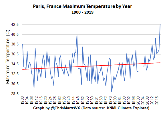 [3] “Maximum Temperature PARIS/LE BOURGET.” KNMI Climate Explorer. Accessed July 26, 2019. http://climexp.knmi.nl/data/xgdcnFR000007150.dat.