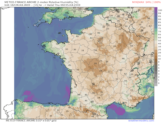 The air over France at the time of Paris’s record high was relatively dry (Figure 4), and as all weather hobbyists or meteorologists should know, dry air heats up faster than saturated air. Had the dew points (and thus relative humidity) been higher Thursday afternoon, the record high may not have been set!
