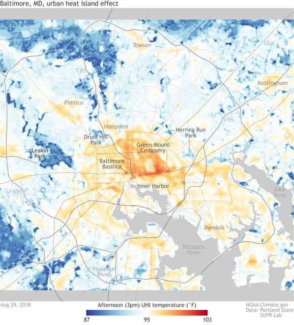 While there is some truth to that (as most of the warming seen in the U.S., for instance, is with overnight temperatures), NOAA has created maps from various U.S. cities of both high and low temperatures.⁶ The map below (Figure 5) is of Baltimore, Maryland’s 3:00 p.m. afternoon temperature on August 29, 2018.⁶ Notice how the city is noticeably warmer than its more rural surroundings, even in the afternoon! I know this from personal experience because I live in Northern Virginia, not too far from Baltimore and Washington, D.C.