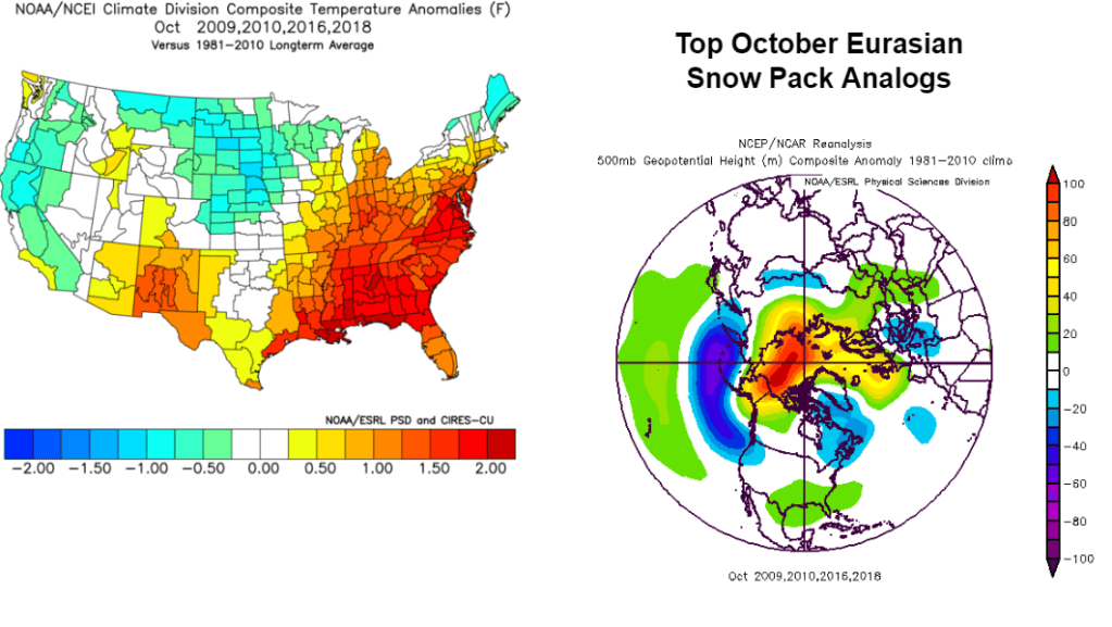 Years where the October snow pack over Eurasia was been similar to this year are 2009, 2010, 2016, and 2018.