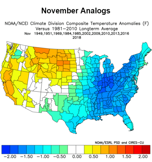 With the data we have looked at in mind, let’s forward the analogs into November. As you can see, the west becomes warm and the east becomes cold. I am thinking this is a very likely possibility.