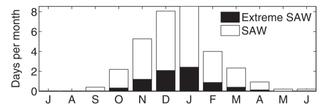In California, very strong north, northeast winds known as the Santa Ana Winds, are perhaps the most notorious wildfire hazards in the United States (Abatzoglou et al., 2013)⁴. These winds are very strong offshore foehn winds that develop in the Great Basin of California⁴ (Abatzoglou et al., 2013), typically during the cool season; autumn through spring (Figure 2) (Raphael, 2003; Abatzoglou et al., 2013).² ⁴ Thus, right off the bat, it should be no surprise to anyone that there are wildfires ablaze in California as I write this; that’s almost like getting surprised when a hurricane hits Florida.