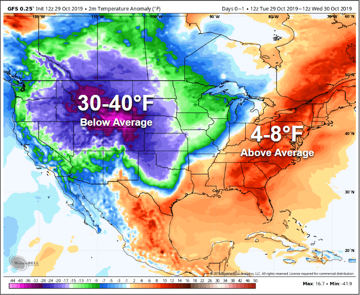 As per the usual setup, a cold air mass migrated southeast out of Western Canada over the weekend and has since settled into the Rocky Mountains. Temperatures this week in the Rockies are some record 30 to 40°F BELOW AVERAGE (Figure 4), and because, once again, cold air is denser than warm air, the cold air has sunk to the surface therefore increasing the atmospheric pressure at the surface and has decreased it aloft (denoted by an upper level trough). Because cold air is sinking, convective cloud development has been shut off leading to clear skies thereby enhancing overnight radiational cooling, which consequently increases the air pressure at the surface, tightening the pressure gradient, leading to stronger north, northeast winds.