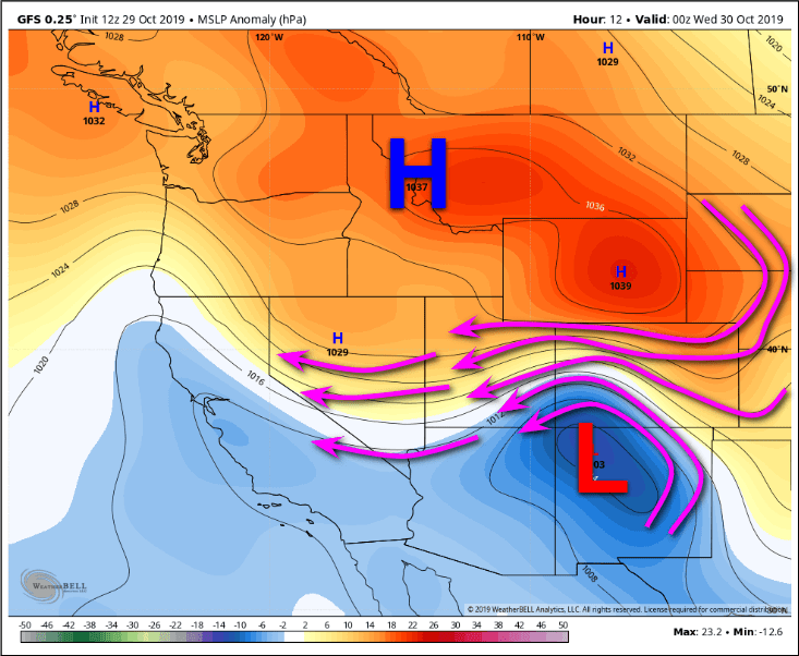 Winds around high pressure systems flow anticyclonically (clockwise) in the Northern Hemisphere, thus when high pressure is situated over the Rockies or Great Basin, the winds blow from the north or northeast towards the Pacific Ocean. If there’s a low pressure area over the Four Corners region, the cyclonic (counterclockwise) flow will aid in reinforcing the north, northeast winds towards the Pacific. As today’s 12z run of the GFS model shows, this is exactly the case currently causing the Santa Ana Winds (Figure 3)