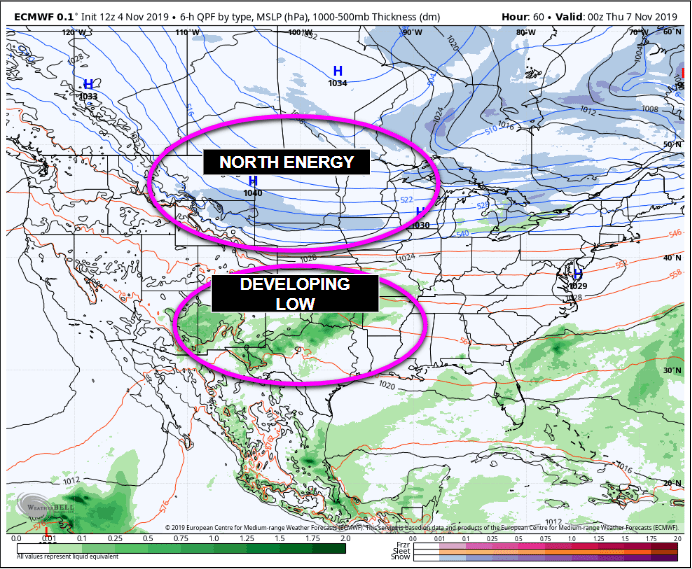 For a better visualization of this at the surface, this first image for Wednesday evening shows our northern piece of energy (which may be an Alberta Clipper) and the developing low over Texas.