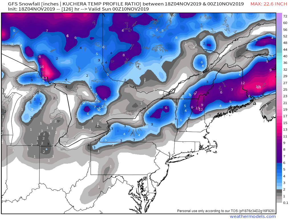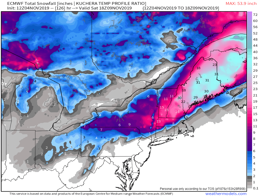 Just to give you an idea of what the models are simulating for the weekend, here is what the ECMWF temperature profile (NOT 10:1 liquid/snow ratios) Kuchera Snowfall map is showing. I like this solution for the most part, but I am almost certain the 15-30+ inches shown across Eastern New York, Vermont, New Hampshire, Massachusetts, and Maine is wishful thinking on the model’s part.