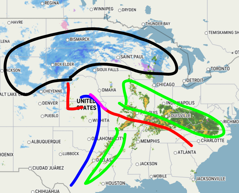 Current radar imagery shows an organized circulation with our storm system. Frontogenesis and sharp temperature gradient across the north quadrant of the storm has fueled heavy bands of snow over the Dakotas, Minnesota, and Wisconsin (black line) with rates of 1-2+ inches of snow per hour. Our cold front (blue line) extends from the low pressure center south into Texas which has sparked some heavy thin rain bands across the Deep South and Mississippi Valley, and the warm front has done the same over the Southern Midwest.