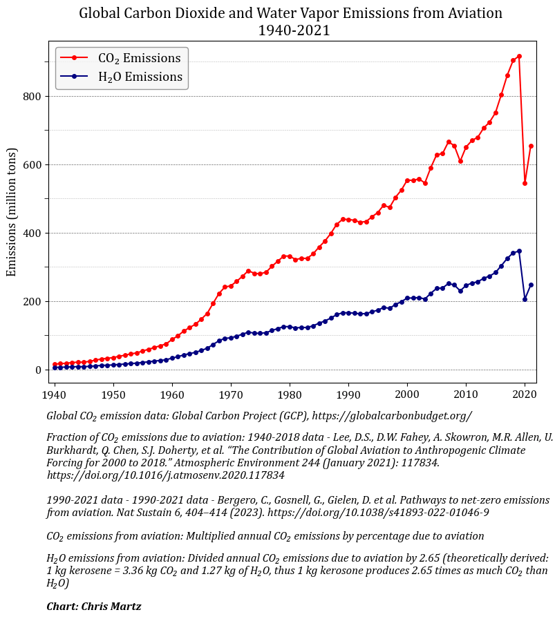 To compute the annual CO2 emissions produced by aviation, I multiplied the global annual CO2 emissions tabulated in the Global Carbon Budget (2024) database by the annual fraction of emissions due to aviation derived in Lee et al., 2021 (1940-2018 data) and Bergero et al., 2023 (1990-2021 data). I then estimated the water vapor emissions by dividing CO2 emissions from aviation by 2.65 (theoretically derived in Box 1) because the production of both gases during combustion are directly proportional to fuel consumption.