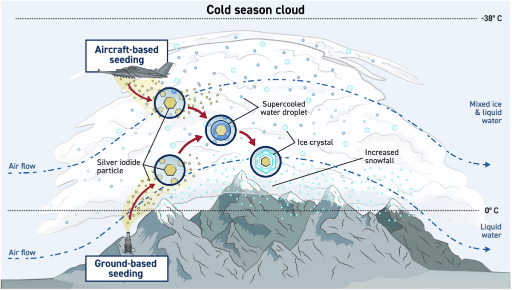 - Glaciogenic seeding (Fig. 6) – introduction of ice-producing particles such as silver iodide (AgI) and dry ice (solid CO2) into wintertime orographic clouds to accelerate the transition from supercooled liquid water droplets to ice-phase hydrometeors with the intention of increasing snowfall.