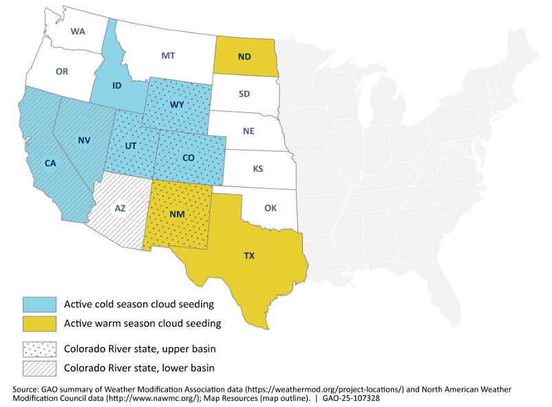 A 2024 report by the Government Accountability Office (GAO) found that there are currently nine U.S. states actively facilitating cloud seeding programs (Fig. 8). These are: California, Colorado, Idaho, Nevada, New Mexico, North Dakota, Texas, Utah and Wyoming. As Fig. 8 below shows, most cloud seeding activities in the U.S. are “cold season” endeavors that are intended to improve wintertime snowpack for water availability in the Intermountain West’s Colorado River Basin, which has been subject to severe drought for much of the last 25 years.