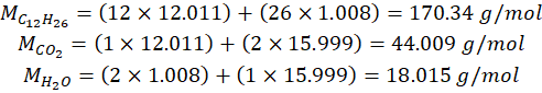 Before we can compute how many kg of CO2 and H2O are produced by 1 kg of C12H26, we must first calculate the molar masses of dodecane and combustion byproducts. Molar mass, M, can be found by multiplying the number of atoms of element i, ni, by its atomic mass, Ai.