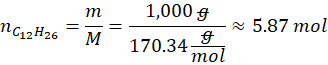 Next, we need to figure out how many moles of C12H26 are in 1 kg of C12H26. To do this, we divide the mass, m, by molar mass, M: