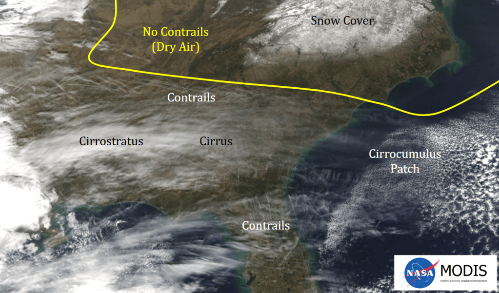 Consider the Moderate Resolution Imaging Spectroradiometer (MODIS) satellite imagery of the southeastern United States taken by NASA’s Terra satellite on January 29, 2004 (Fig. 4). Notice that contrails can be seen protruding out from the cirrostratus cloud mass over Alabama and Georgia, crisscrossing the sky over Dixie. Then, notice that the contrails and cirrus gradually stop approaching the border between North and South Carolina, as marked by the yellow line I annotated. Notice also that there are no clouds north of that region. The air at such altitudes was too dry to support cloud formation. If these clouds were deliberately being “sprayed,” they’d appear over North Carolina and Virginia too, as well as over south Florida.