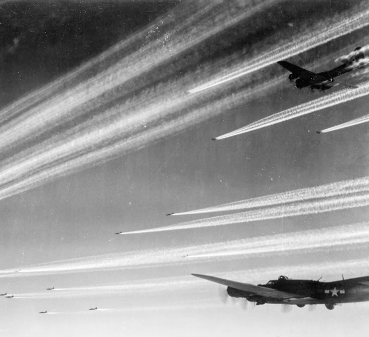 Today, the sky is filled with airplanes, and thus condensation trails are visible daily almost everywhere. In the 1940s and 1950s, they were indeed a rare sight, however, we have video and photographic evidence of them dating back to World War II (Fig. 3). As a matter of fact, condensation trails played an important role in military operations during the war, particularly aerial combat (or “dogfights”). Allied bombers like the B-17 Flying Fortress or Axis aircraft could be spotted from great distances by enemy fighters and ground-based anti-aircraft units due to contrail production.